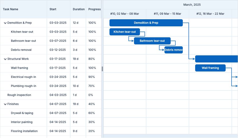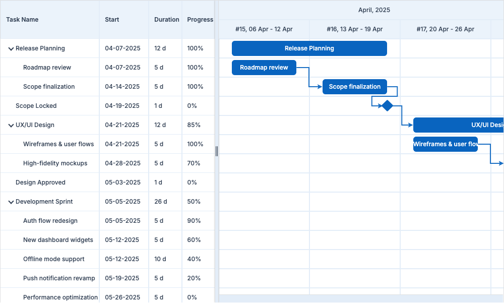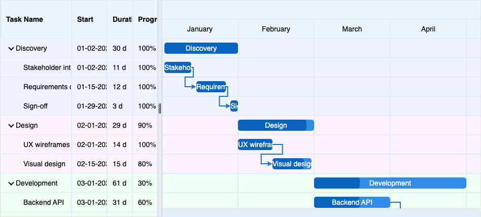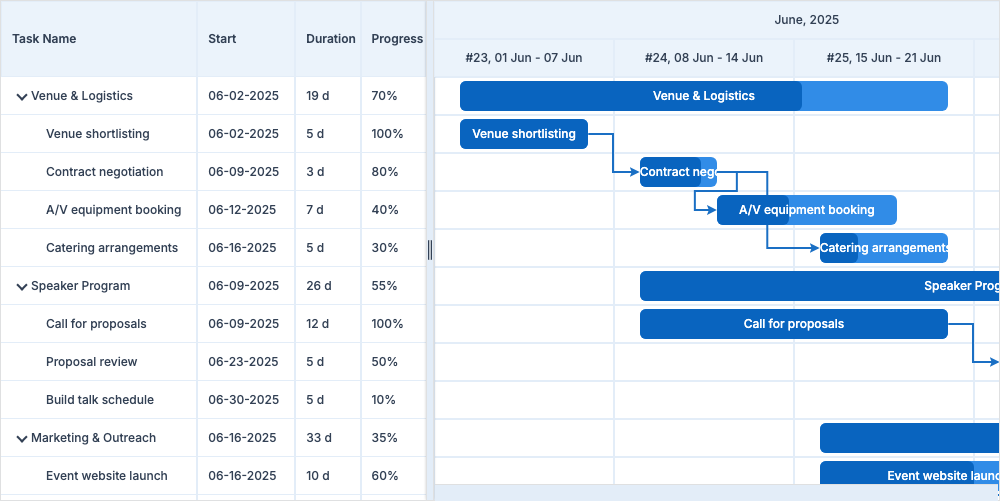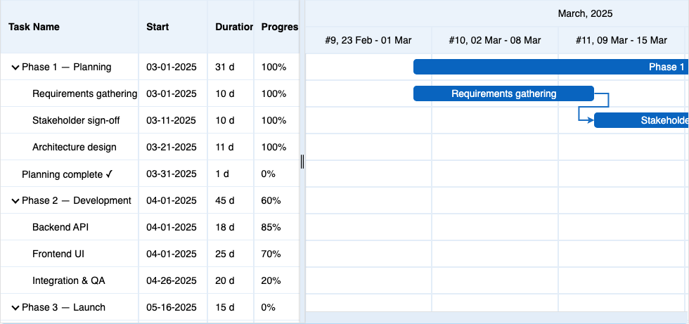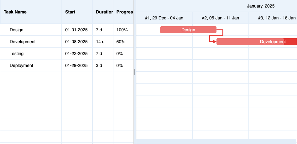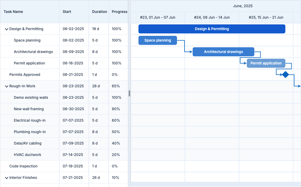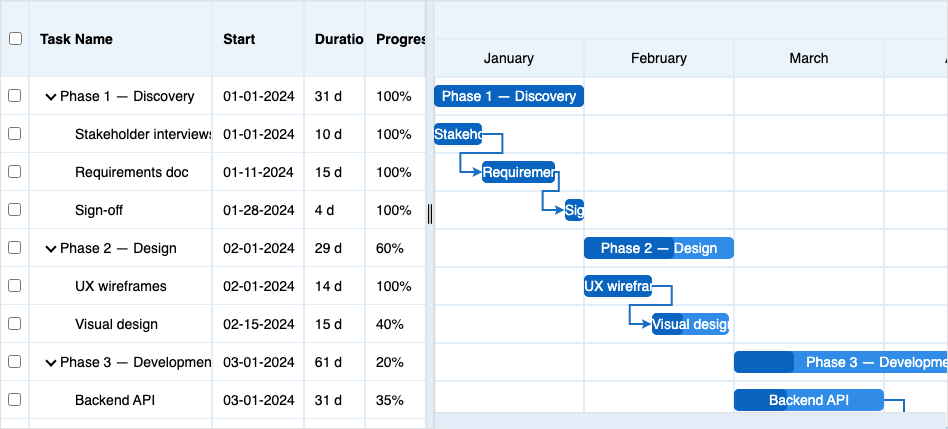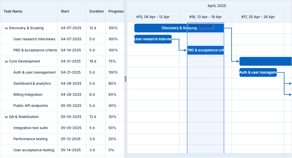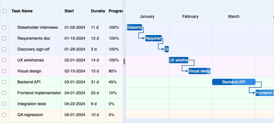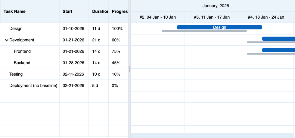 Home > ApexGantt > DemosApexGantt DemosFRAMEWORKS Angular React VueBasic GanttBaselineCritical PathCustom ColorsInteractionsAnnotationsMilestonesAccessibilityDependency TypesResource ManagementSelectionTask List ColumnsToolbar