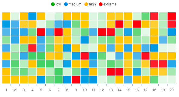 In a multi-series heat map chart, each row in a heatmap can have it’s own lowest and highest range and colors will be shaded for each series. Helpful in situations when each series has a big difference in values.