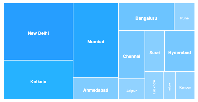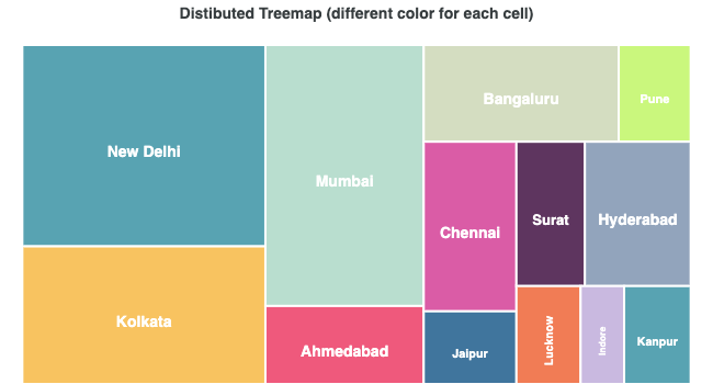 options = { chart: { height: 350, type: "treemap", }, series: [ { data: [ { x: "New Delhi", y: 218, }, { x: "Kolkata", y: 149, }, { x: "Mumbai", y: 184, }, { x: "Ahmedabad", y: 55, }, { x: "Bangaluru", y: 84, }, { x: "Pune", y: 31, }, { x: "Chennai", y: 70, } ], }, ] }